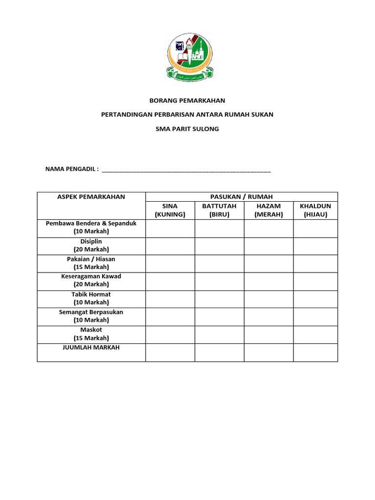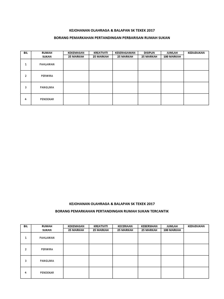 Borang Pemarkahan Perbarisan Rumah Sukan : Perbarisan rumah delima untuk hari sukan sdm 2019.. Rumah ( 25 markah ) ( 25 markah ) ( 25 markah ) ( 25 markah ) ( 100 markah ). Bilpasukan kekemasan pakaian keseragaman disiplin jumlah. Rumah kekemasan kerjasama hiasan kebersihan jumlah. Documents similar to borang pemarkahan pertandingan perbarisan rumah sukan.doc. Peraturan dan skema pemarkahan peperiksaan peraturan dan skema pemarkahan peperiksaan percubaan spm.