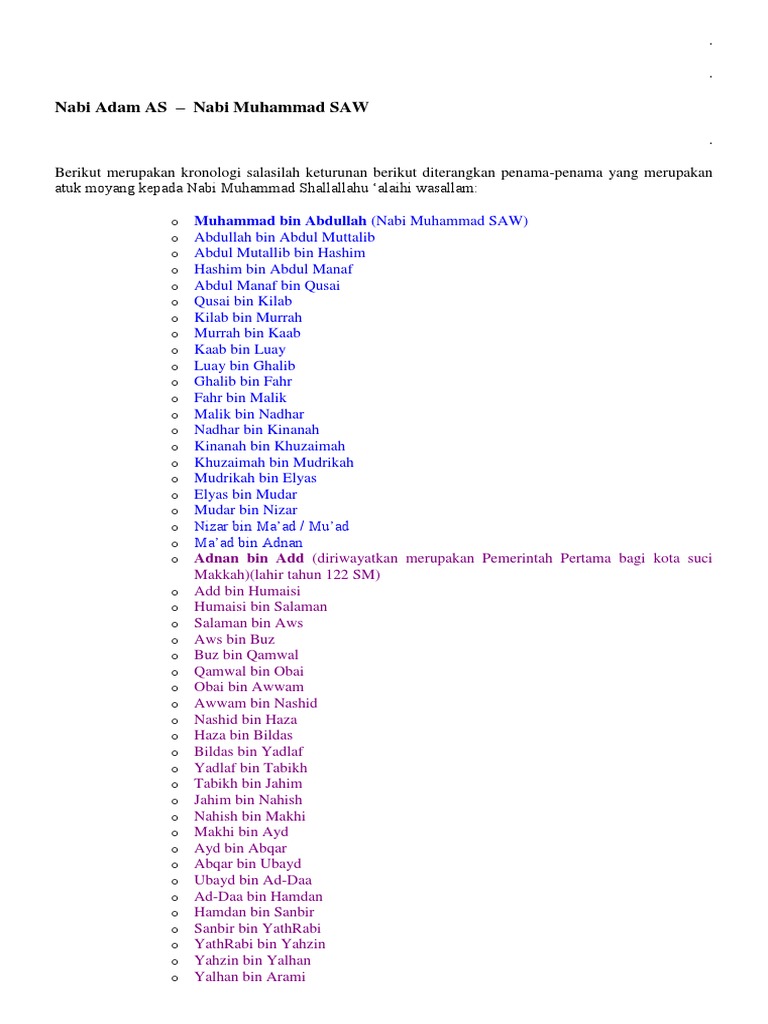 Silsilah nabi muhammad mulai ibrahim/abraham sampai keturunan rasul yang terakhir. Muhammad lahir di hari senin, 12 rabiul awal tahun 571 masehi (lebih dikenal sebagai tahun gajah). Hal ini kemudian sekaligus meruntuhkan keraguan kalangan. Mengenal silsilah nabi muhammad saw oleh von edison alouisci nasab nabi muhammad saw ada tiga susunan atau bagian tentang nasab habaib adalah cucu keturunan nabi muhammad saw dari anak putri nabi muhammad saw yang bernama sayyidatina fatimah. Artikel ini memberitakan silsilah habib rizieq shihab yang sampai ke nabi muhammad.